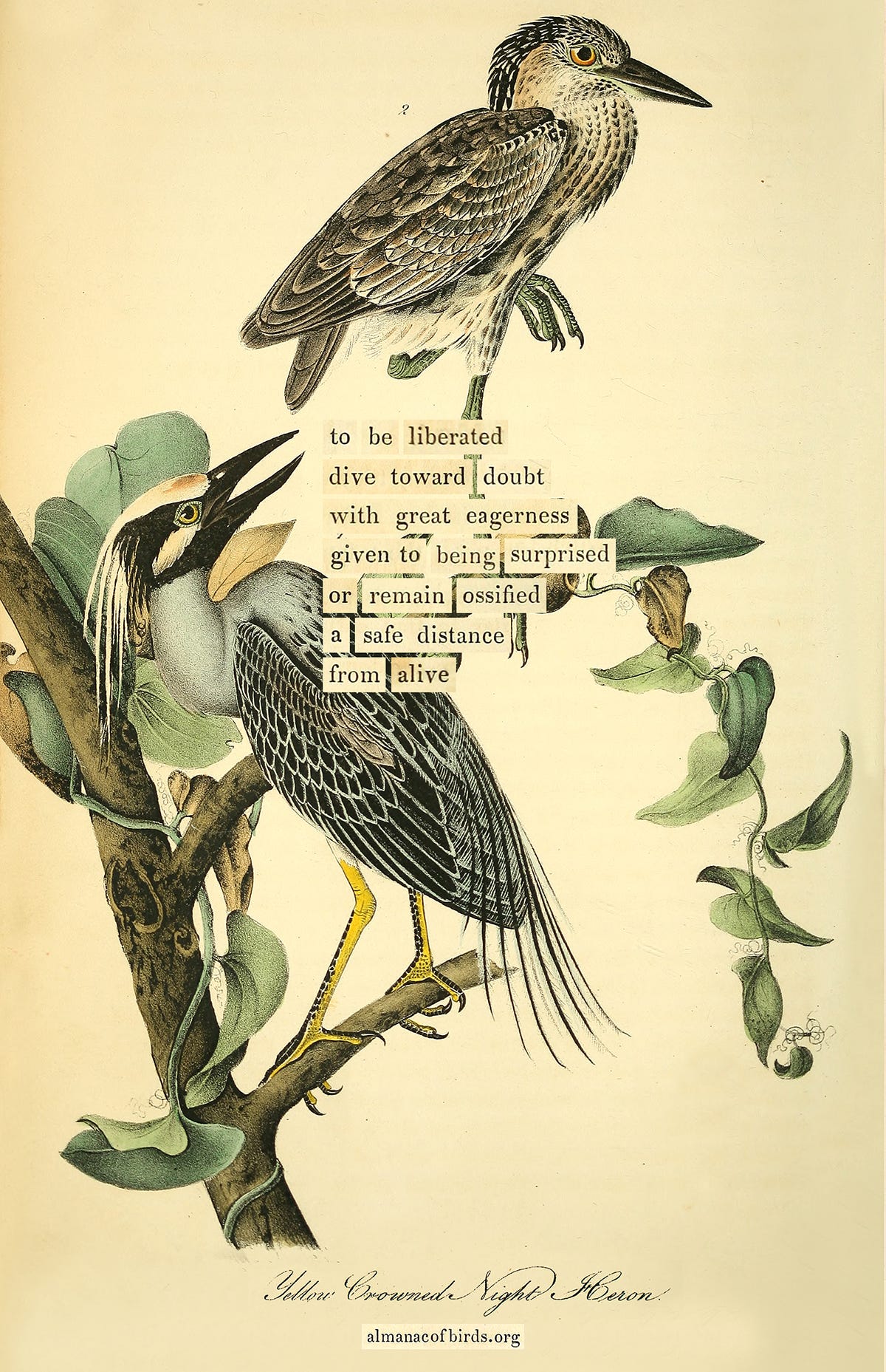 Maria Popova made these collages of birds and compiled them into an almanac. The only thing I can say about the visuals is that they feel retro, which evokes nostalgia for opening old print books.